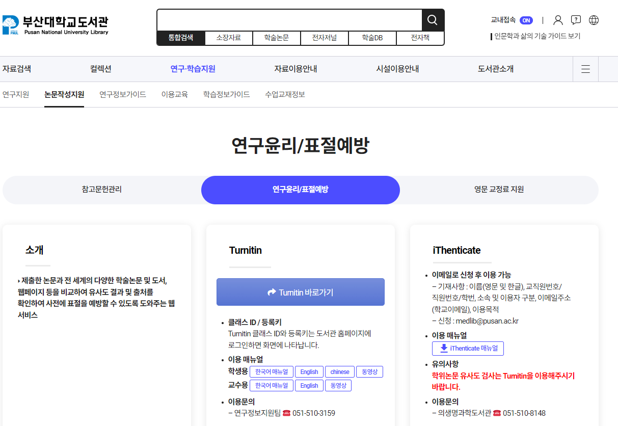 부산대학교 도서관 홈페이지 - 연구.학습지원 - 논문작성지원 - 연구윤리/표절예방